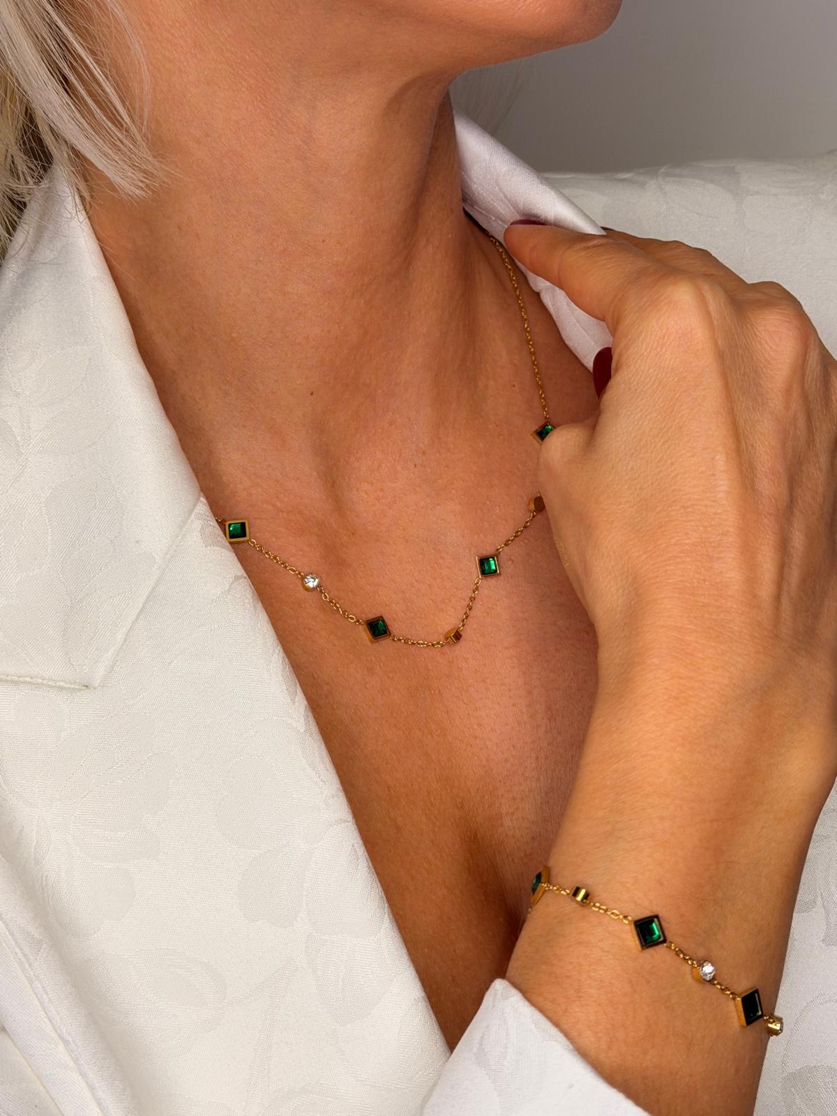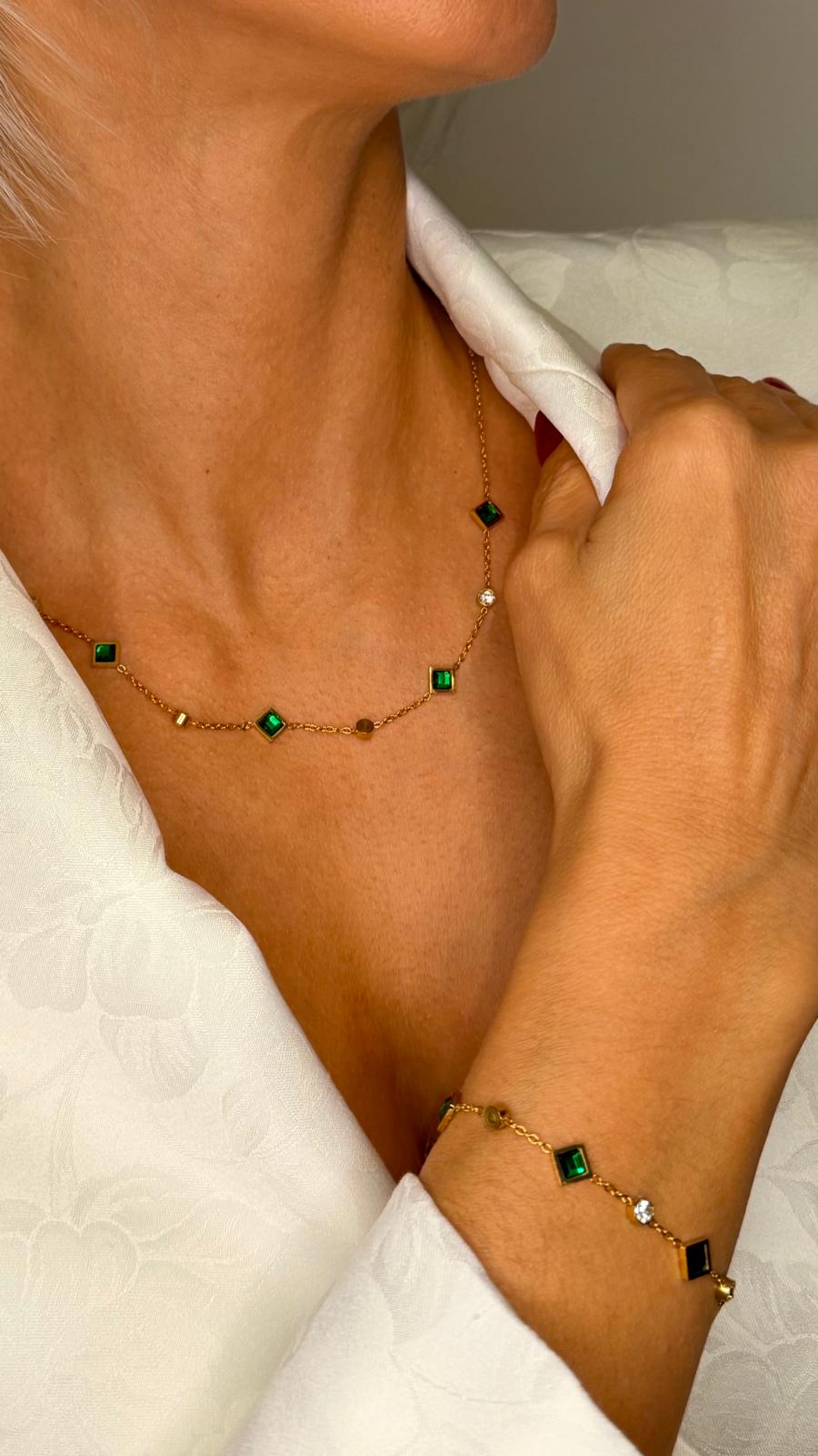 Os brilhantes verdes, dispostos em pequenos quadrados, criam um efeito geométrico moderno que contrasta harmoniosamente com os brilhantes redondos em branco, estrategicamente separados ao longo do colar. Este jogo de formas e cores oferece um equilíbrio perfeito entre originalidade e requinte.