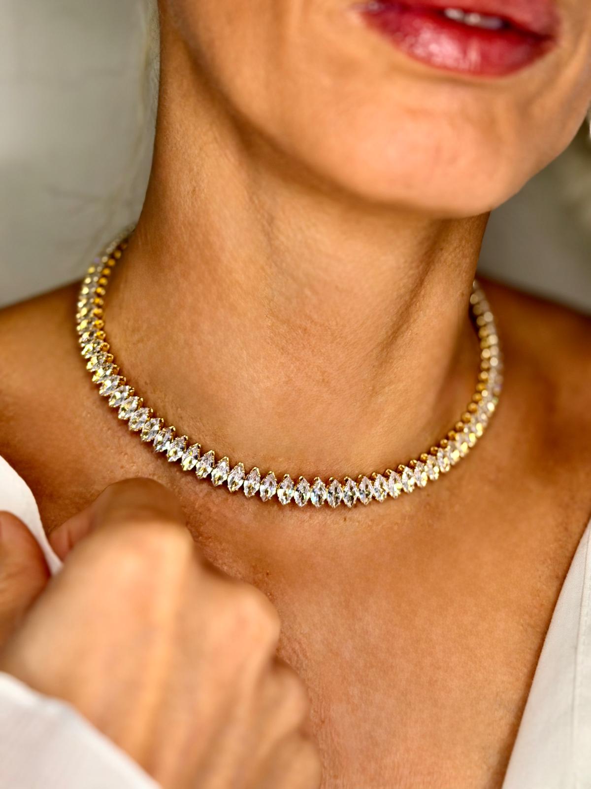 Cada brilhante garante o máximo brilho e transparência, resultando em um acabamento impecável. A montagem precisa proporciona conforto ao usar e um caimento perfeito, acompanhando delicadamente o contorno do pescoço.